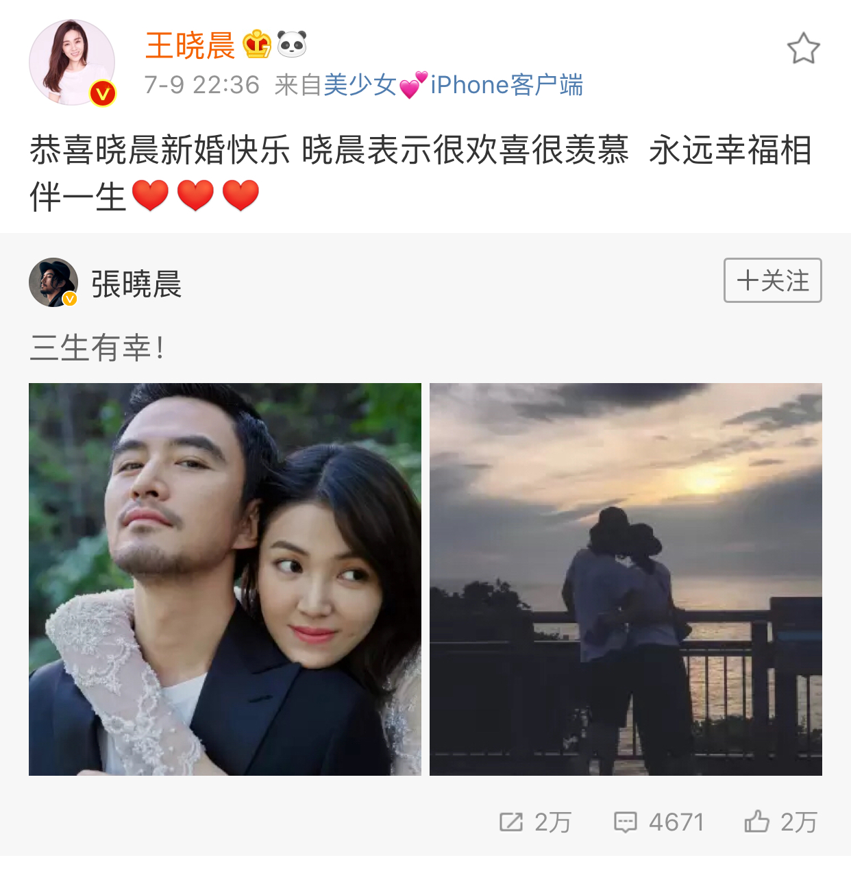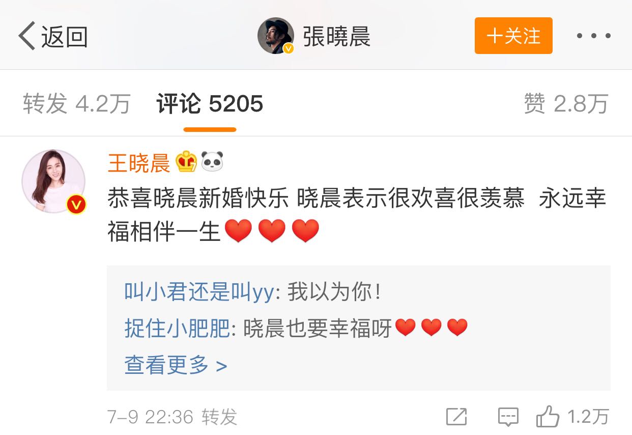昨天,人气演员王晓晨第一时间在微博上为张晓晨宣布婚讯的好消息送上祝福,并配文:“恭喜晓晨新婚快乐 晓晨表示很欢喜很羡慕永远幸福相伴一生。”