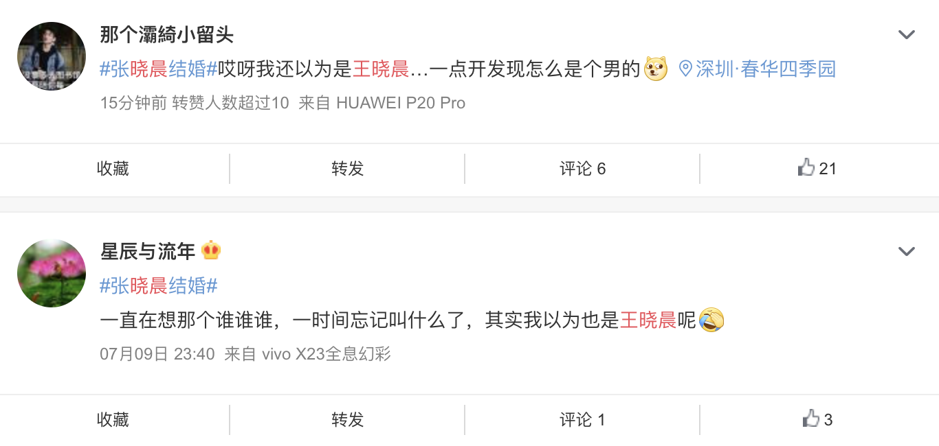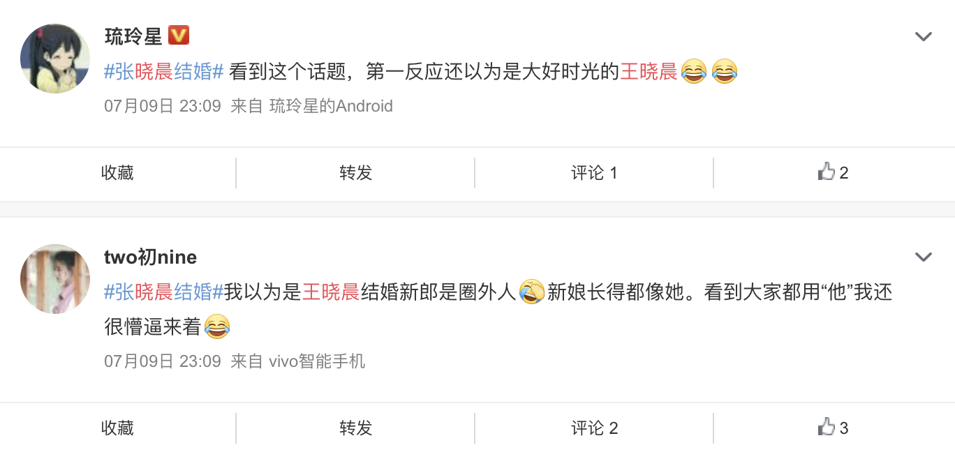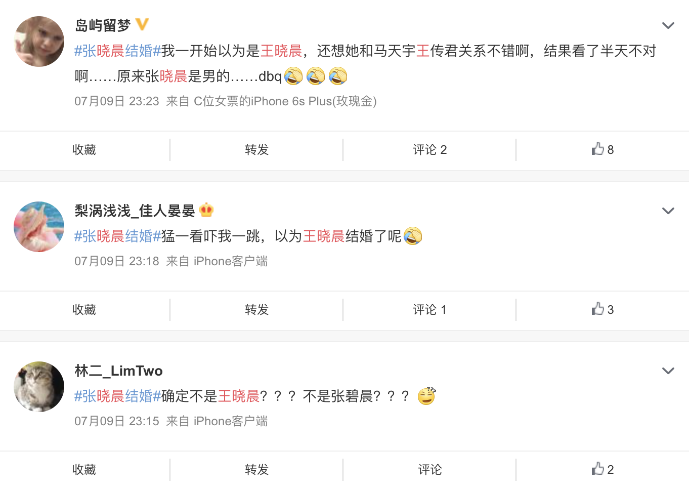 网友纷纷表示:“有没有人跟我一样把张晓晨看成王晓晨的?张晓晨王晓晨张碧晨张晨光傻傻分不清,是时候去配眼镜啦!吓得我以为女神结婚了……”“虚惊一场,赶紧搜了搜王晓晨的微博,应该不是只有我一个人闹了乌龙吧,新娘还和王晓晨有几分相似。”“吓我一跳,还以为是王晓晨结婚了,点开一看不是,我就放心了~”