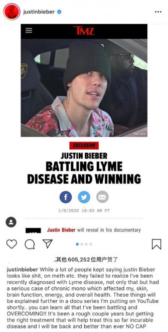 1月8日,贾斯汀·比伯通过社交平台发文透露近况,回应外界长期以来的质疑,并如实向外界公开了自己的身体状况,称:“虽然有些人一直在讨论我的外貌状态,但事实上他们不知道的是,我患上了莱姆病,不仅如此,还患有严重的慢性单核细胞病,影响了我的皮肤、大脑功能、精力和整体健康。”