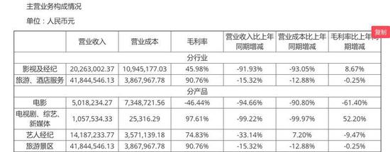 事实上,北京文化原有主业旅游景区、酒店服务在今年上半年营收4184.45万元,约为影视及经纪业务营收的2倍,而前者的毛利率高达90.76%。